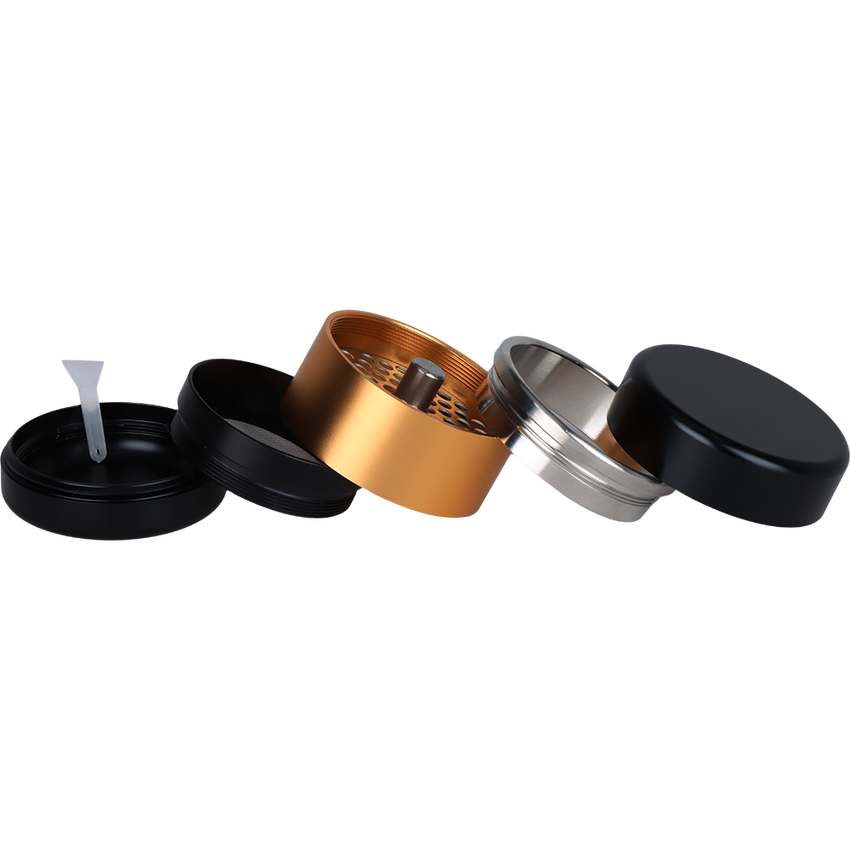 The Aluminum Manually Operated Herb Mill has a unique toothless design that prevents over-grinding, preserving the texture of delicate herbs. The 5-piece design includes a solid top with a grinder plate insert, a grinding chamber, a sifting screen, and a pollen chamber base. The aluminum build is quite durable and each grinder includes a scraping tool. Colors vary.